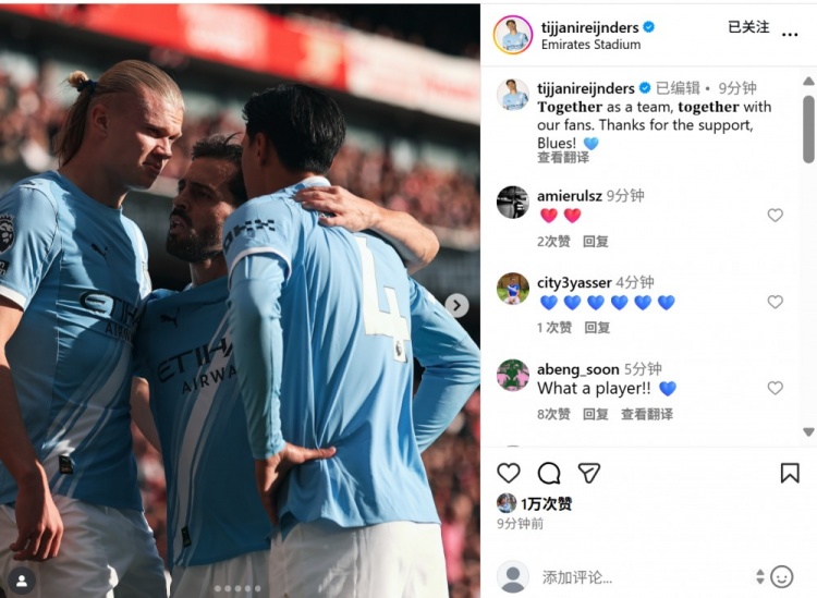 赖因德斯也在社媒晒出与哈兰德、B席庆祝进球合照,配文写道:“我们要团结一致成为一个整体,与球迷同样如此。感谢蓝月球迷的支持。”