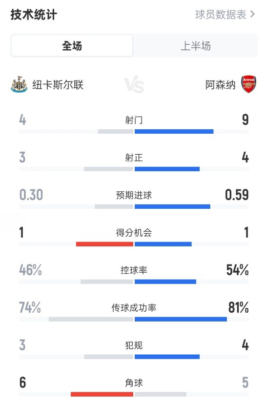 9月29日讯 2025-26赛季英超联赛第6轮,纽卡斯尔主场迎战阿森纳,半场纽卡暂 1-0阿森纳。 半场数据如下: 射门 4-9射正 3-4预期进球 0.30-0.59进球机会 1-1控球率 46%-54%传球成功率 74%-81%犯规 3-4角球 6-5