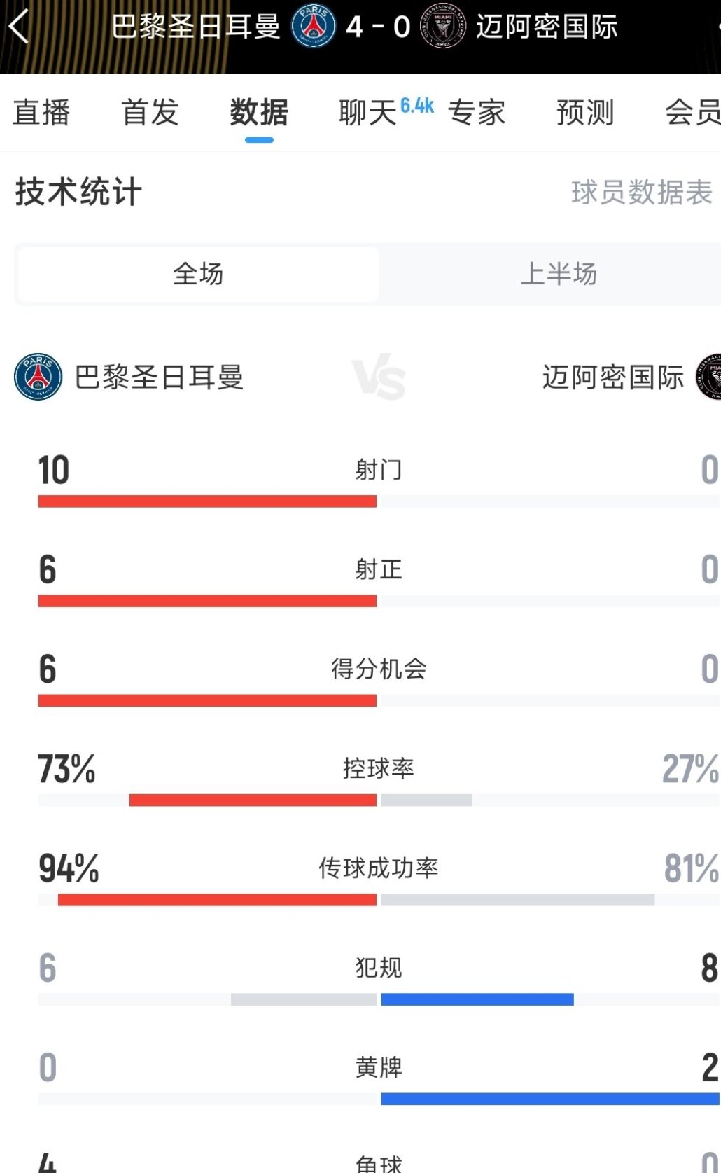 06月30日讯 世俱杯1/8决赛,巴黎圣日耳曼vs迈阿密国际。上半场比赛结束,巴黎4-0领先迈阿密。半场数据如图所示。巴黎圣日耳曼vs迈阿密国际半场数据:射门10-0射正6-0得分机会6-0控球率73%-27%传球成功率94%-81%犯规6-8黄牌0-2角球4-0